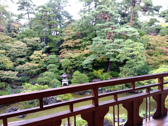 二階から庭園を見下ろす。もみじにはまだ早いが、だからこの程度のお客さんで済んでいるのかも。鯉がいました。