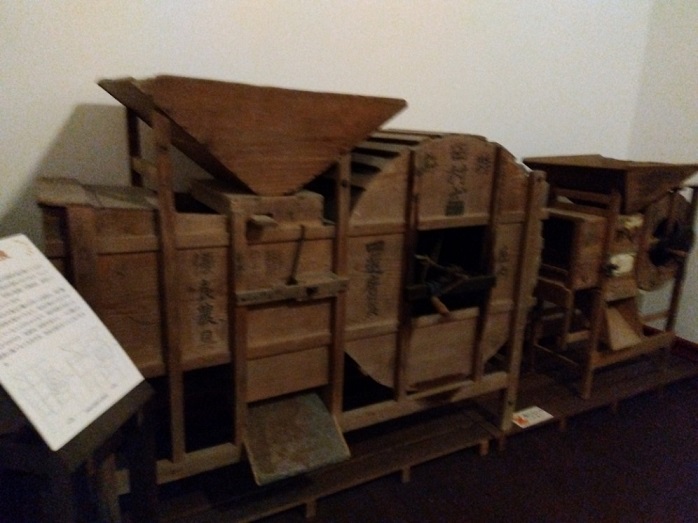税関庁舎内にあった「唐箕」の展示。この二台は「ろうと」が着脱式。別途、「ろうと」合体式のものがあり、またこの地域には、足が4本脚のものと10本脚のものがあるとの分析がされていた。全国流通をはじめ考究すべきことがたくさんある唐箕だが、このように形態や機能上の分析をしているのは初めて見ました。すばらしい。