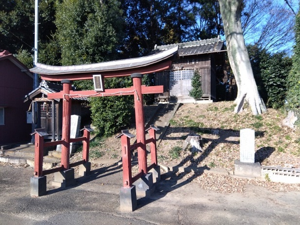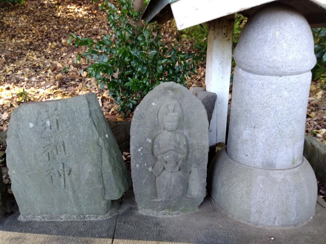 神社向かいの石造物群。屋根のついているのが「十九夜塚」。十九日に農家の主婦らが集まって講を開いていたそうです。