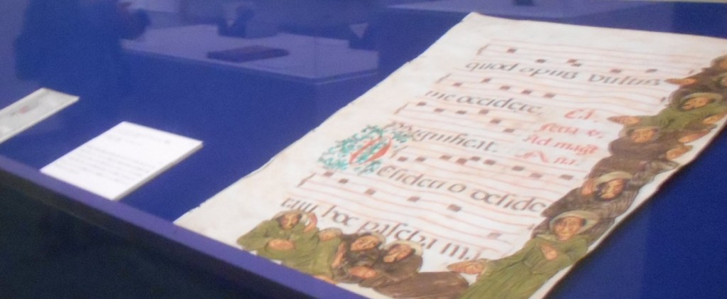 中世合唱の音譜。九人の修道僧が描かれている。坊主だから地味ですが、おもしろおかしい。