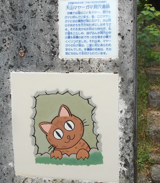 マヤーガマは、王府時代、化け猫が近所の子供たちを食ったりしたので、名高い力士が退治した。ネコはこの先の洞窟(ガマ)に逃げ込み、さらに力士に追われてガマの中の甕に逃げ込む。力士はその甕に蓋をし、左綯いの縄で縛りつけたので、マヤーは出られなくなったという。
