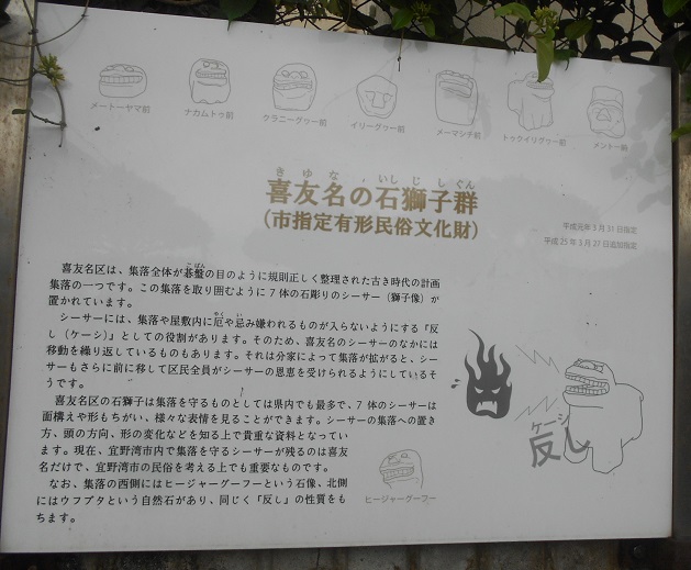公民館にある喜友名の石獅子(シーサー)群の案内板。集落内には綿密?な都市計画に応じて7体の石獅子があるとのこと。全部発見できるかな?
