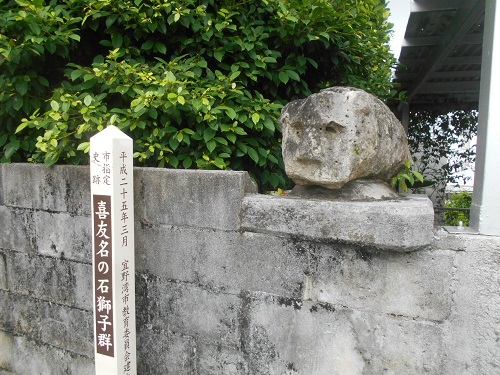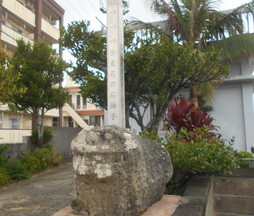 石獅子に見えますが、これは石獅子としては番外で、ヒージャークーブという石像。明治時代に新たに「反し」が必要になったため追加されたものという。なおクーブは「こぶ」です。