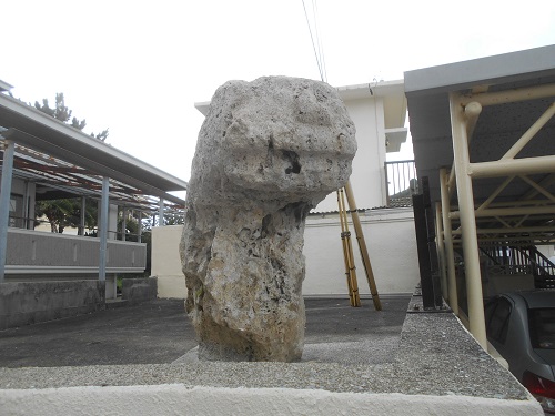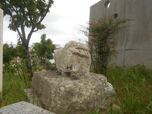 メートーヤマ前のシーサー。これは頭部で、胴体部分と思われる石が公民館にある、とのことですが、見つけられなかった。