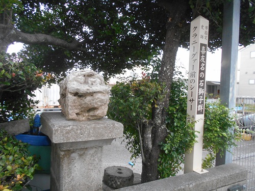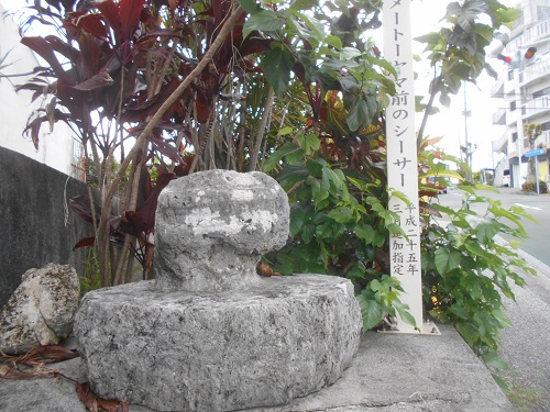 クラニーガー前のシーサー。ひねくれたような顔がかわいい感じである。