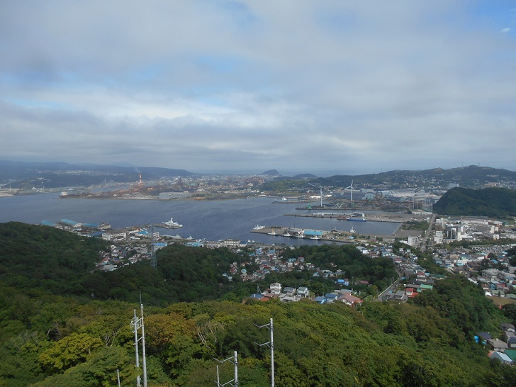 測量山から室蘭港、製鉄工場などを見下ろす。「測量山」は明治初年のフランス人のひとが測量の起点にすべく目を付けたところだそうで、三角点があります。太平洋側、駒ケ岳・噴火湾方面を含めて室蘭四方がすべて見渡せるすばらしい景色です。