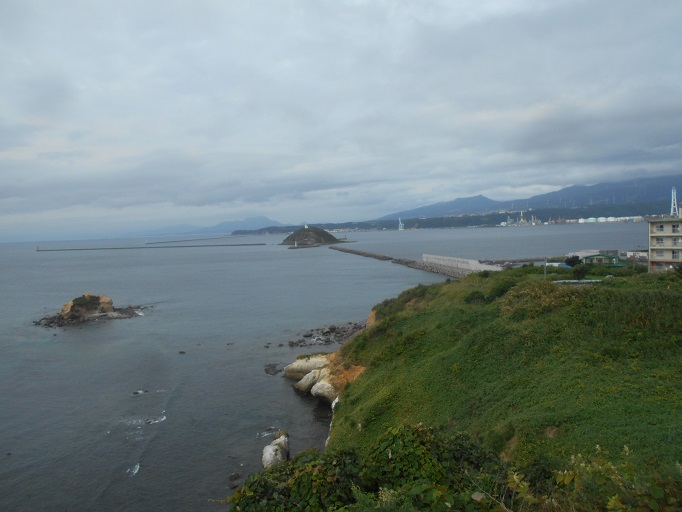 絵鞆(えとも)岬(公園から大黒島方面を見る)。「絵鞆」は幕藩時代の室蘭の地名で「えんるむ」(突端、岬の意)が語源という。大黒島の右手の入江に絵鞆番所が置かれた。その向こうは噴火湾である。
