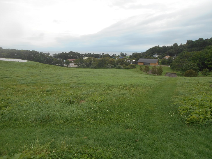 でかい。農地を買い取って遺跡として保存しているようです。この丘肌一帯が遺跡で、長い時代にわたって人が暮らし、大規模な貝塚を作ったそうです。左手隅にある白いところは貝塚跡の一つ。丘を降りた先に海が見えますが、縄文時代はこの丘の下(真正面の繁みのあたり)まで海だったそうです。