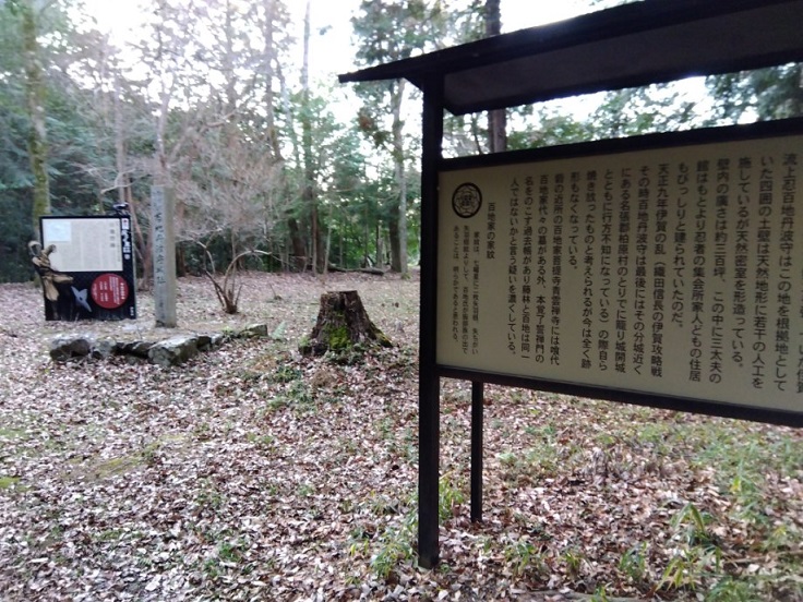 〇百地砦(百地丹波守館)跡 ・・・ 伊賀の土豪の館跡として典型的な遺跡です。信長さまに虐殺された「天正伊賀の乱」で反信長の中心になった百地丹波守はここでは全滅せず、別のところに立て籠もったそうですが(百地丹波守自身は行方不明)、男女300人が住んでいたというこの砦跡はそのまま廃城となり、現在は三重県下屈指の〇霊スポットと言われるのですがががががががががが。