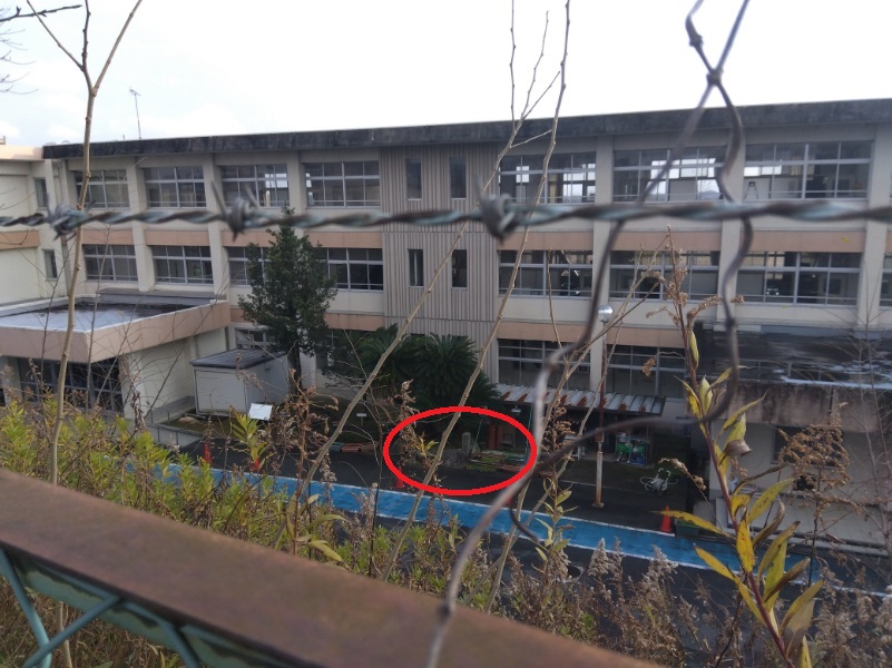 小学校の敷地が城跡となっており、近づけません。学校の奈良街道側の高台(ここもおそらく城跡の一部と思われます)から覗いてみました。〇印の中に城址碑と、奈良街道の道しるべがあるようです。