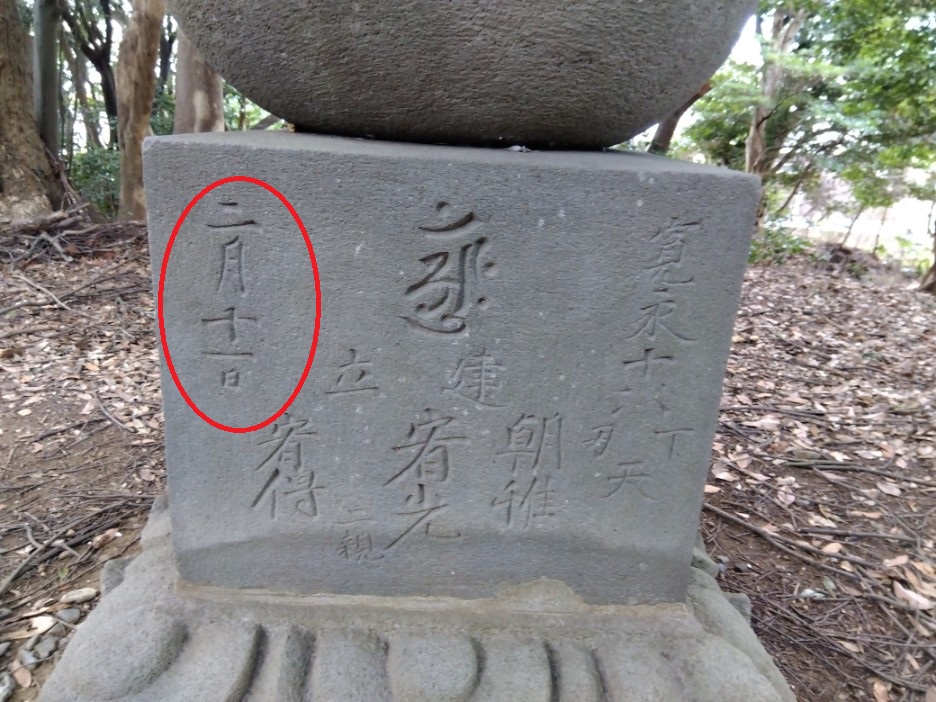 〇馬加なんとかさんの首塚 ・・・ 堂の山のお墓を通って裏山に登るとあります。中世の人だそうです。もともと千葉氏の支族で、千葉本家を滅ぼした人なんですが、自分もやられてしまった・・・のでしょうか。何代かあとで滅んだ、ともいうようです。彼の首塚として江戸時代に入って寛永年間に、方墳の上に建てられた五輪塔。建てられたのが二月十一日と書いてありましたので、御縁があって来たのでしょう・・・か。
