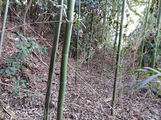 冒険主義的歴史民俗研究者なので登ってみました。堀切部分に入ってしばらく行ってから振り返ってみたもの。左手に主郭らしいのがあるのですが、登ってみてもまた竹藪。背後はしばらく行くと川の付け替え時に削られた断崖になります。