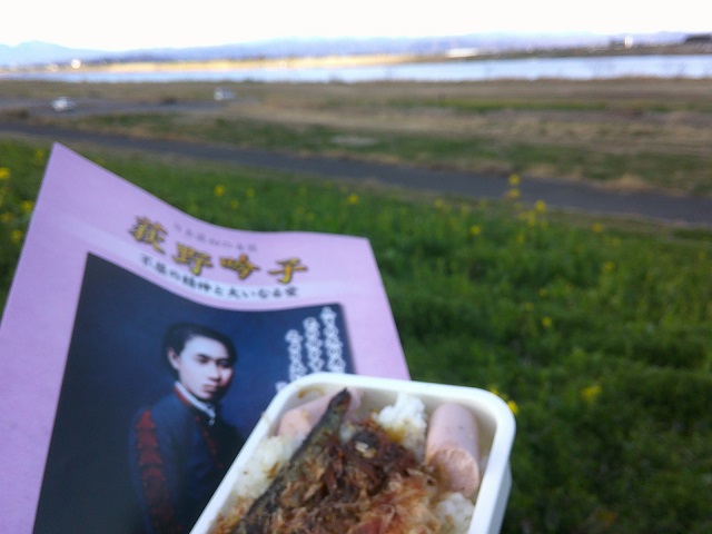 上の石碑の裏はすぐに利根川堤防になっています。堤防にてやっと昼飯食う。記念館でもらったパンフ。いろいろ詳しいです。医療史研究者だと名乗ってきてしまいました。