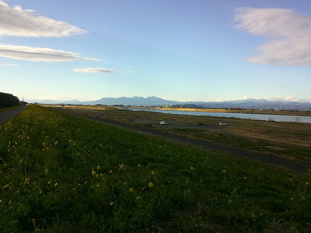 堤防にはもう菜の花が咲いていた。利根川の向こうに赤城が見えます。我が心もこのように明朗でありたいものですね。可能なら。
