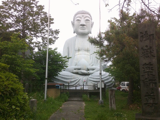 昭和24年、同所の整骨師が御嶽薬師教を感得し、私財をなげうって手作りで作ったコンクリート像。像高は12メートルで、奈良の大仏よりも高い。お顔の不思議な優しを見よ。