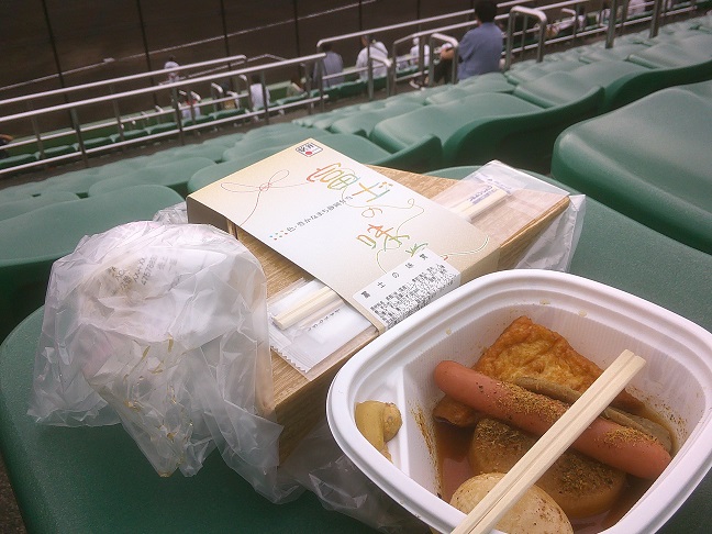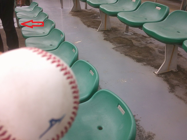 飛んできたファウルボールを拾って写真撮影。ミズノのマークがついています。いわゆる違反球なのだろう。近くにいた子どもにあげようかと思ったが、すでに矢印のスタッフが近づいてきており、没収される。