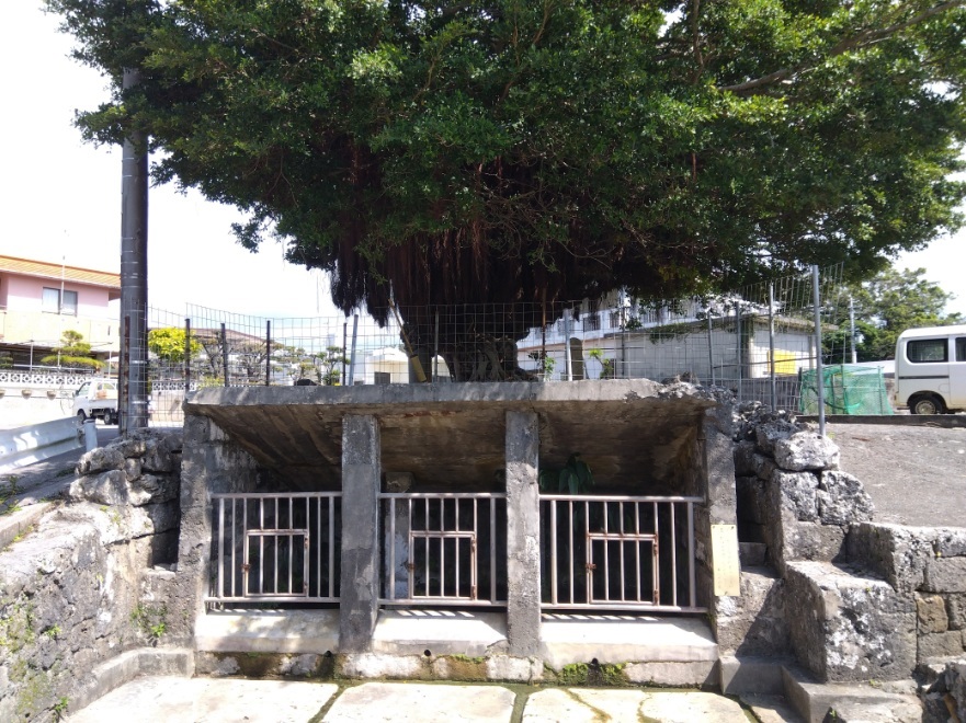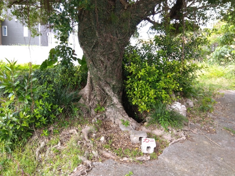 カーの向こう側にあるのが名木・三連がじゅまる。三本のがじゅまるの木が一本になっています。樹齢150年というので、琉球藩時代でしょうか。