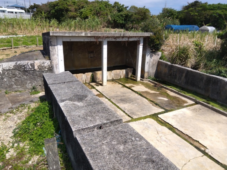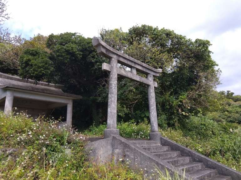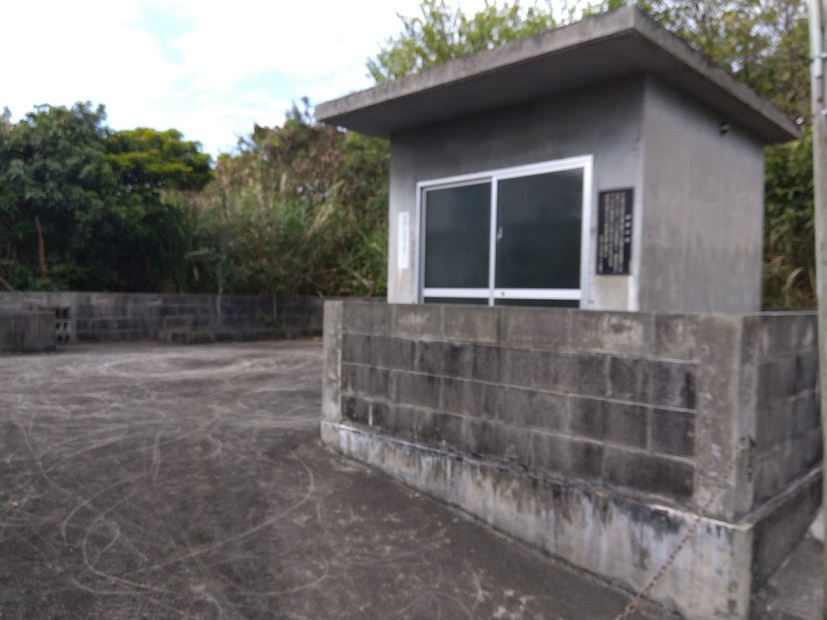 コンクリ製の殿(とぅん)から、拝所を望む。国頭の方の「あしゃぎ」に当たる祭事場です。「崩壊きけん立入禁止」と書いてありました。