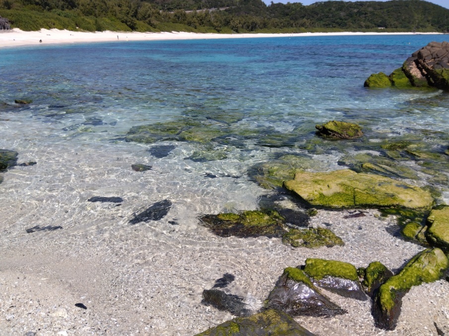 この岬を回り込んだ東側が、世界でも大人気の「潜り場」古座間味浜です。