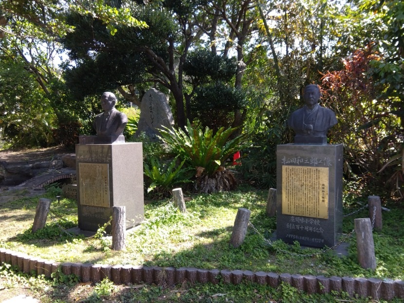 ノロ宮のすぐそばに小学校があります。校庭にある、右は名産鰹節「けらまかつう」を世に広めた水産業の松田和三郎、左は教育者で衆議院議員にもなった安里積千代の胸像です。