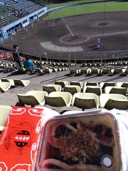 途中で日陰になってくると少し肌寒いので、三塁側に移動。五回のグランド整備中は日向に横になって気持ちよく寝てしまい、六回二死になるまで気づかなかった。