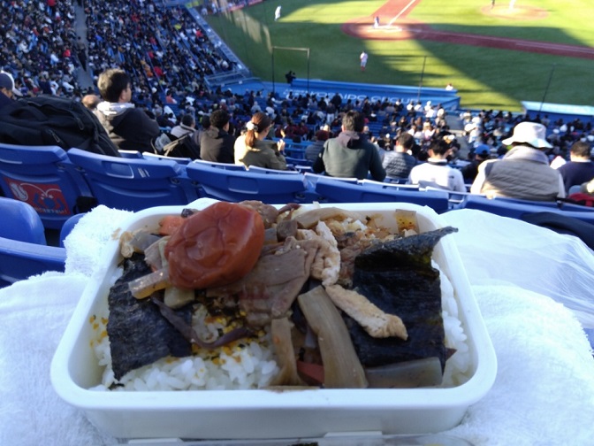 一塁側の方が長く日が当たるので一塁側の最上段に座ります。青学→青、富士大→赤、で赤青対決になっていておもしろい。