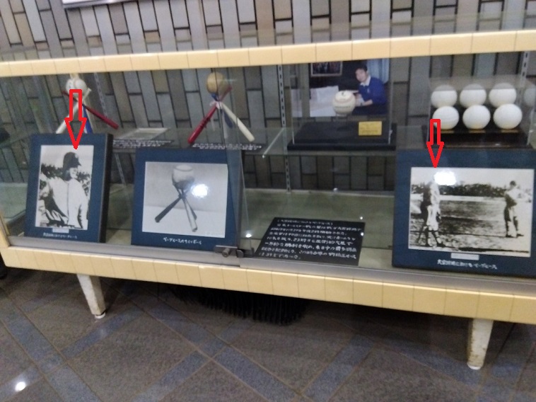 球場内(普段入れないところ)にあった展示物。こんなHPごときで叱られてたまるか、と思うので写真載せます。矢印は、大宮球場でのベーブルース氏。このとき全米オールスターとして来日していますが、もう39歳だったんですね。大宮球場(跡地の一部が今の県営球場)でもホームランを打っているそうですが、ここでの試合は23-5で、全米は10本のホームランを打ったという。