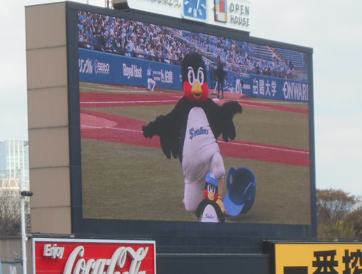 半年ぶりでつばくろう空中くるりんぱを見る。まだオープン戦でスタジアムDJのパトリックが来てないので、こんなところで成功するわけにはいかないであろう。シナリオどおりである。