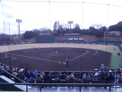 試合終了。ライトポール向こうの梅の花が盛りです。もうすぐレフトやセンターの桜も咲いてくるよ。