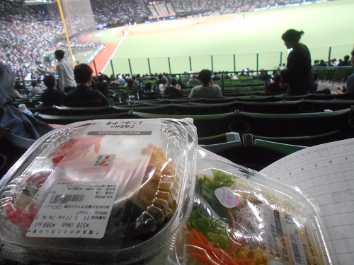 久しぶりで来ました。が、座ったと思ったらもう終盤だ。こうなるのわかるので今年は高いパリーグは観に来ないようにしている(野球ファンのせめてもの自衛である)のだが、見に来ざるを得ない日程にしてあるんですよ、セリーグが。