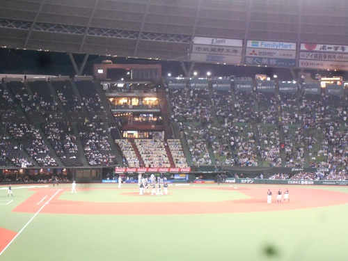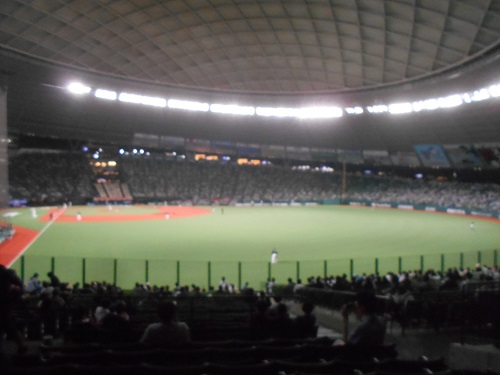 六時に会社が退けたので挨拶して出かけました。地下鉄→地下鉄乗り継いで、池袋で1850の急行に乗り込みます。かなり混雑しています。途中地震があったといって緊急停止しますが、五分ほどで発車。西所沢で狭山線に乗り換えます。新宿線が後れたので一本連絡を待って発車。西武球場前駅到着、電子チケットを出して(ここは持ち物検査を口頭だけで対応してくれるので楽ちん)ポール際席(一番安い)に入って・・・目を疑いました。何にもミスも失敗もしていないのに、もう七回表だったのだ!