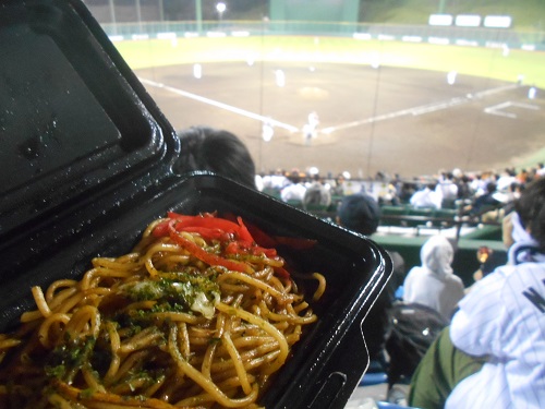 今日は生ビール半額デーだそうで、平日夜だが1210人集まったとのこと。生ビールは売店だけなので、一つ(窓口は二つ)しかない売店に長蛇の列だったが、八回になったらビール販売終わって急に空いたので、やっと焼きそばを購入。ここのは美味いんです。値段はコロナ中に上がったままですが、量はほんとに減ってしまいました。