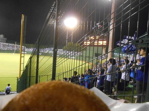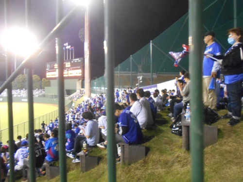 亡命もままならず鉄格子の向こうにうなだれている、のではありません。外野側のドラファン。今年からチャンステーマもかっこよくなってよかった。