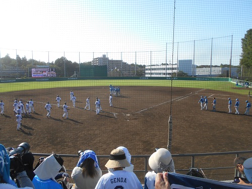 この写真は四回表、東海理化の四番・門叶(とかの)が逆転2ランを打った後。もしかして、というキモチにさせる一発でしたが・・・。東海理化の応援はかっぽれみたいなやつ、JR東日本は新幹線らしいぬいぐるみが踊ったりしていて、苦笑してしまいます。