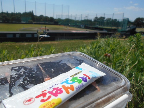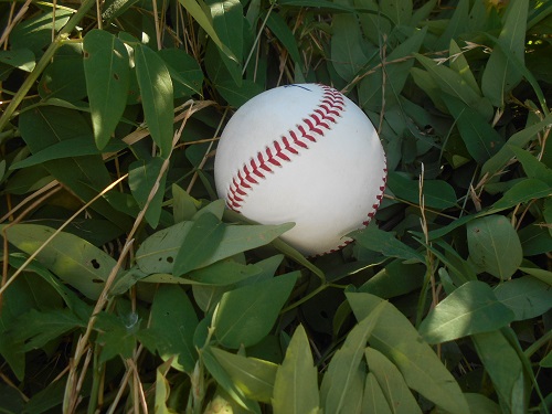 こんなところに奥村の打ったファウルボールが。ここはバイトくんが草むらから回収するのですが、今日はファウルが多かったから回収しきれなかったのでしょう。では拾っておいてバイトくんに渡してあげなければ。バイトくんはどこに行ったかなあ、このままにしておくわけにもいかんしなあ。