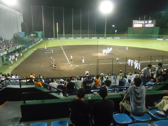 試合終了。このころには大分ひとが減っていました。照明の明るさ、空の黒さ、周囲の静かさ、子どもの多さ・・・昭和のころ、たばこの煙の臭いと一緒におやじと観ていた中日スタジアムや大阪球場を思い出して、涙にじむ。年に一回か二回連れていってもらっていたのだが、それがこんなにじじいになっても忘れられないとは。遠いところまで来たものだが。