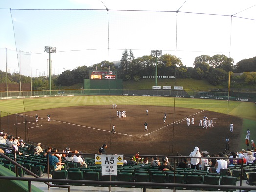 いつものネット裏に座りますよ。日差しはときおりさしてくるのですが、だいたいは曇り。暑いのは暑いが蝉の声とか、もう昨日までとは違います。