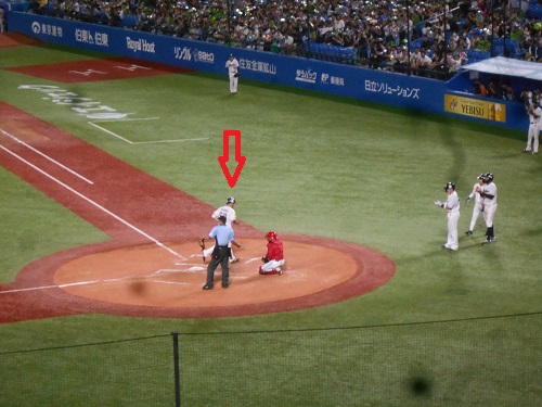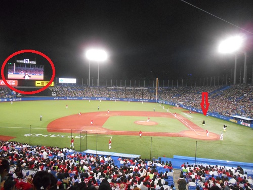 今日もSS氏のおかげ、しかも招待券で無料だ。三塁側パノラマ席。雨降ってないときはこのあたりもよく見えていい席です。