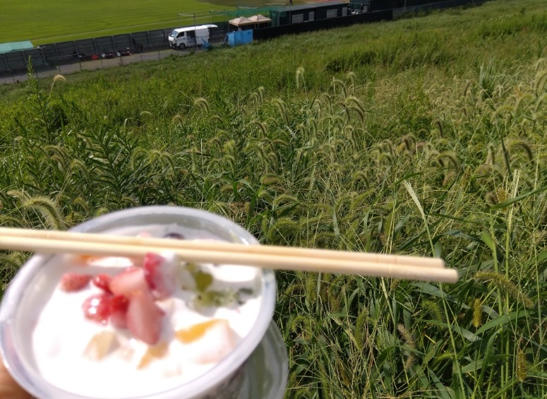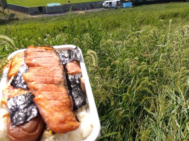 今日は昨日と逆に、イーグルスが逆転。七回までスワロは沼田と長谷川でがんばって、七回裏に西田がこの日2本目のタイムリーで勝ち越し。しかし、八回表、梅野が出てきて3安打で2点とられて逆転、その裏二死満塁にしてまた西田に回ったんですが、さすがにここは遊飛で凡退。九回表は尾仲がエラーがらみで失点、その裏、一死一二塁にしたんですが、山崎の鋭い当たりが二直併殺になってしまいました。今日も暑かったんですが、土手の高い方に座ったんで、風があって生き延びることができました。