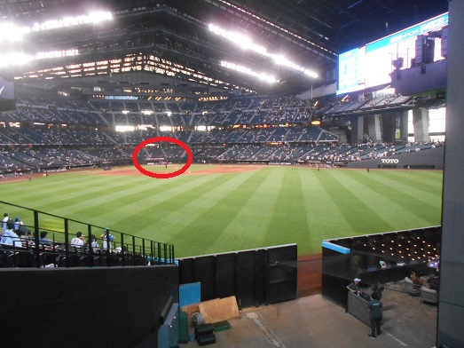 今日は一塁側三階席だ。昨日の外野四階席は右手上の切れたあたりにあります。