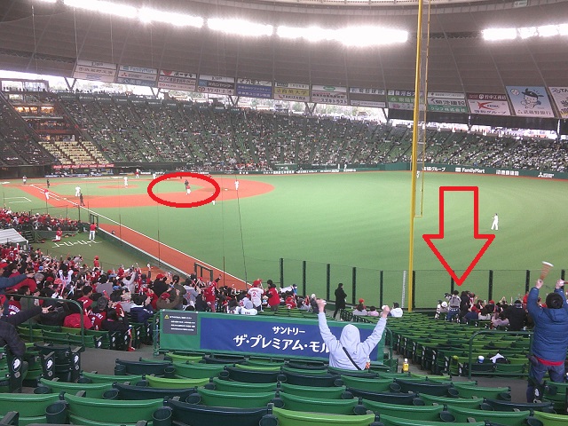 カープ田村のホームラン。あれよあれよと矢印のポール際に入った。ボールの伸び方がぐいぐい来ますね。遠くからでも上半身が大きいのがわかります。