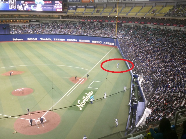 一昨日とだいたい同じところで観ています。この三連戦は、一階席ポール際と二階席が同じ値段だったので、この球場の二階席は見易くていいのですが、今日は名古屋遠征の荷物背負ったままだったので、楽な一階にさせていただきました。