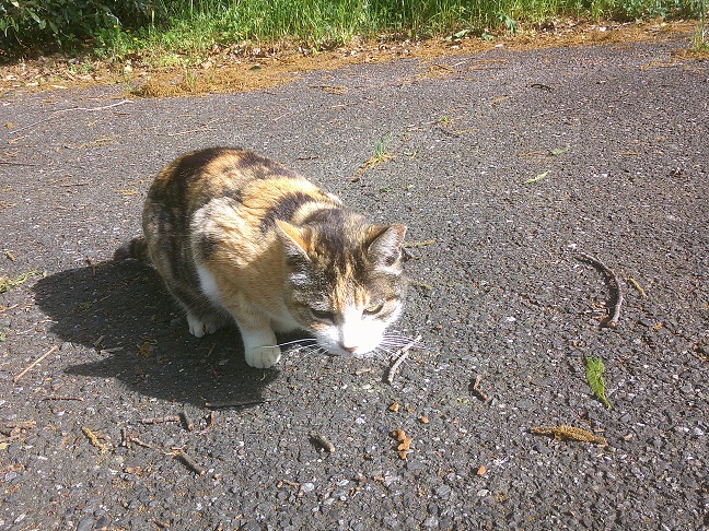 前回もいたネコです。今日みたところ後ろ足が悪いので動きがゆっくりしているのかな。ワルの顔してますがエサ食ってくれた。ありがとうにゃ。