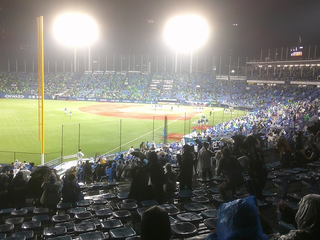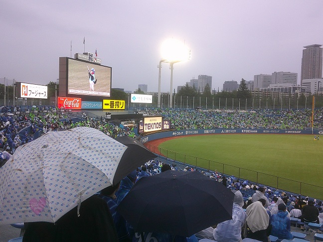 試合開始前から降ってまいりました。ベイスのポンチョが見つからないので、鎌ヶ谷ハムのポンチョを持って来たが、これは緑色で、スワロだと思われるとマズいかと思ったが、試合展開的に大丈夫でした。