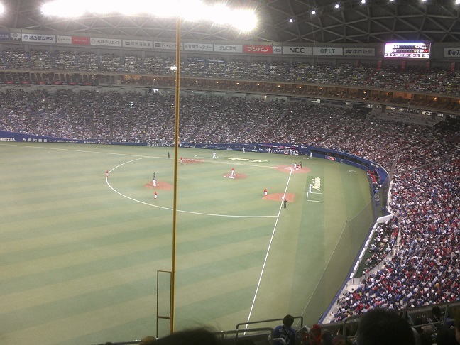 一番安い五階席の一番後ろだからこんなふうにしか見えませんが、ライドラ(ライト側外野のドラども)の声はよく聞こえます。純粋にがんばってるなあ、と感心します。