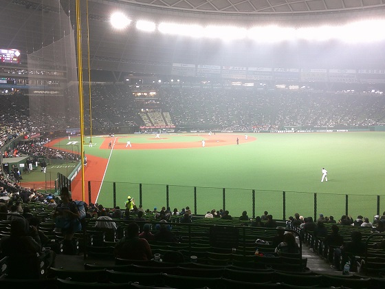 昨日とほぼ同じ場所だが、なんだかもやがかかっているように見える・・・のはそのとおりで、もやがかかっているんです。外は冷たい雨。西武球場名物の大自然と一体化した野球だ。さすがは全天候型野外球場の名に恥じない。