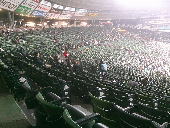 これが昨日「完売御礼」になっていたのと同じ場所だと信じられるでしょうか。もやで人が見えないのではないんです。雨で花見もできないんだから見に来てやればいいじゃないかと思うのですが、それには都心からはあまりに遠い。そして、西武鉄道はいつも野球ファンを見下したような接続しかしてくれない。