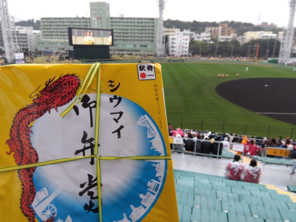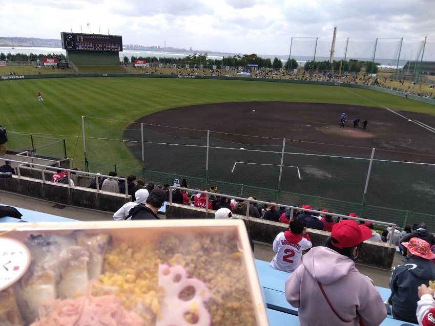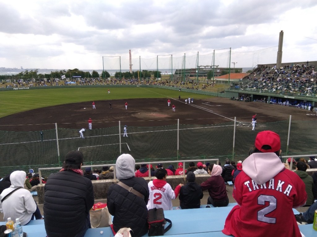 試合も見ています。途中で外野席にも行きたかったけど、腹が苦しくて動けない、だけでなく、電子チケットを呼び出して見せるのがめんどくさいのでやめときました。とにかく寒かった。