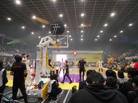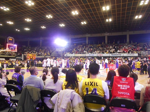 Hさんのご支援で、OM氏と一緒に観戦。OM氏は今日も朝からしごとで昼になって飛び出してきたので昼飯を食ってない、という。二時間で終わって都心で見られるバスケが限界、という生活のようです。