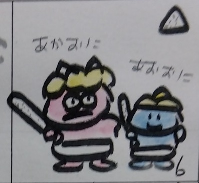 (あか)おれたちは友だちだ、おにぎりも分けて食べるぜ。(あお)そうでちたか。にやにや。